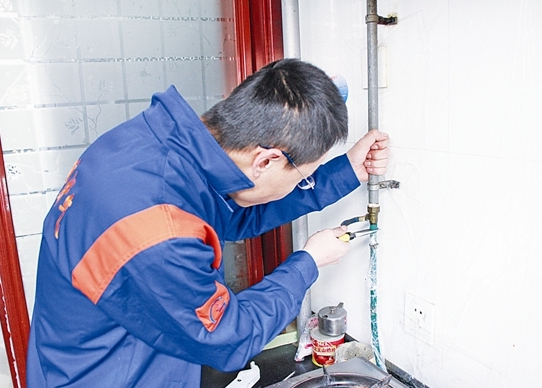 ▲2015年3月15日,在市區(qū)海天花苑小區(qū)的一戶居民家里,經(jīng)緯燃氣公司的工作人員正在檢查燃氣管道。